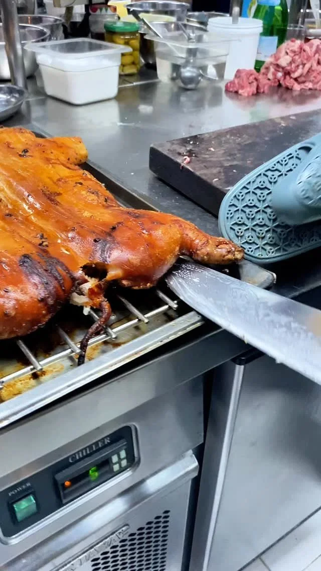 Order 48 hours in advance. 4kg of slow-roasted suckling pig. Tender white meat, crispy skin. Sharing 6-8 people. (contains pork)
