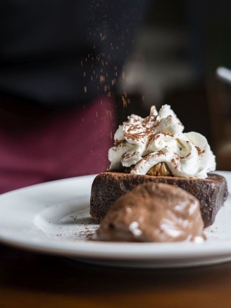 Triple chocolate brownie served warm with Argentine caramel, fresh cream and chocolate ice cream (also available gluten free)